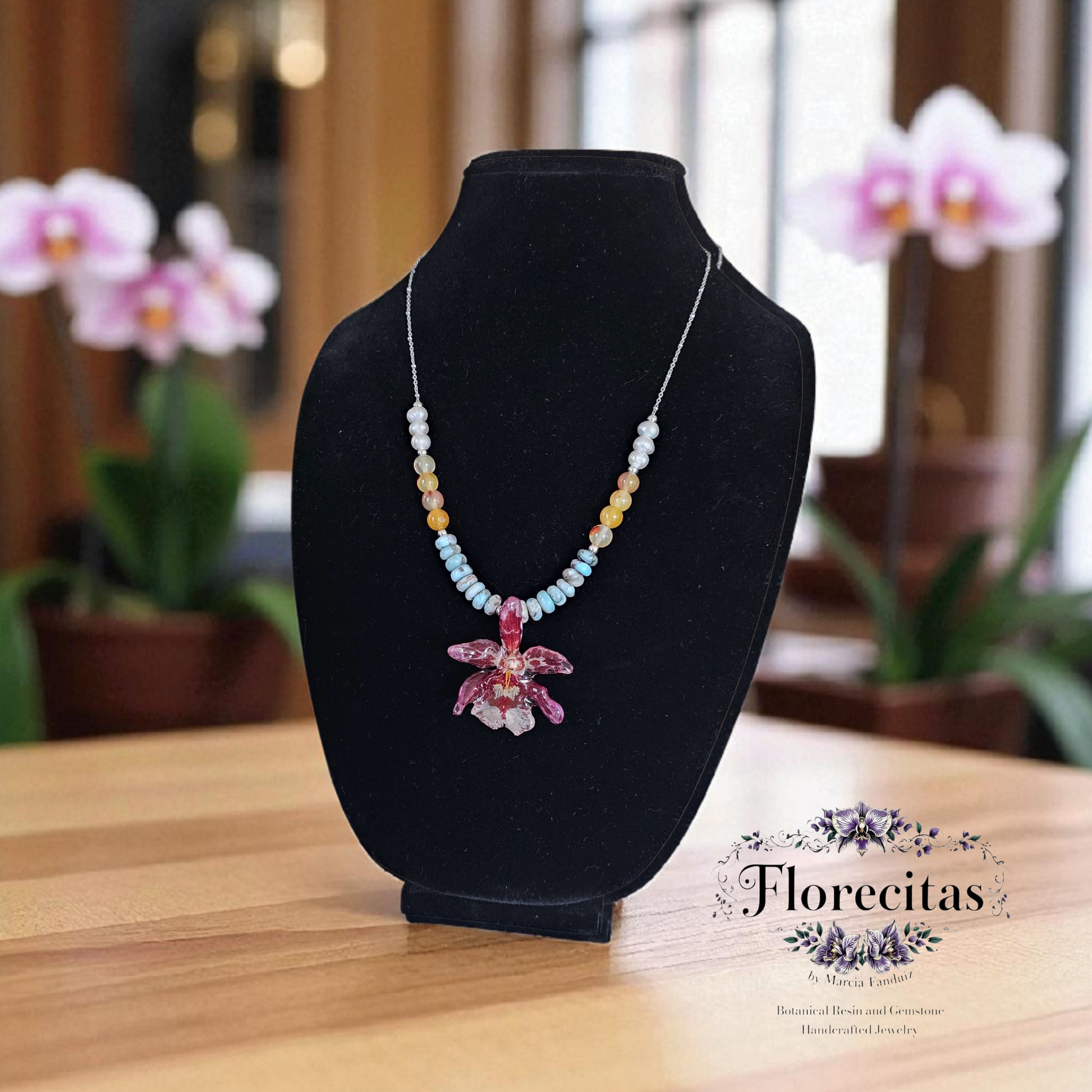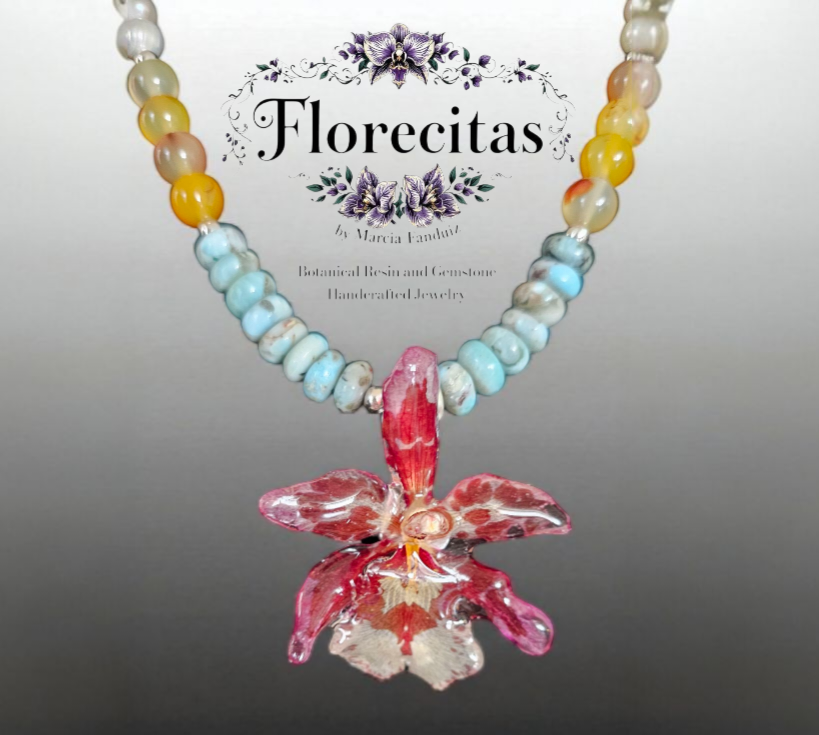 Genuine Eye Candy Pinkie orchid in resin, amber, pearl, and larimar beads